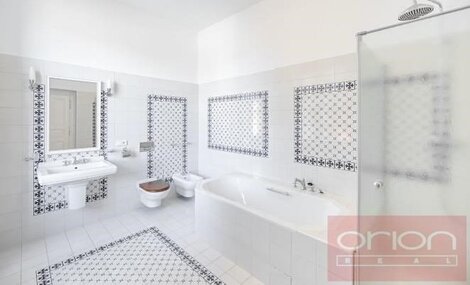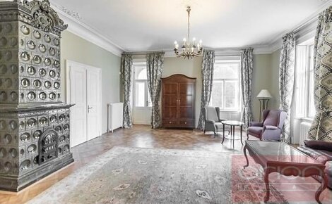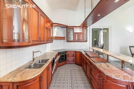 Nabízíme k pronájmu luxusní třípatrovou vilu o rozloze 827 m2 po kompletní rekonstrukci při zachování všech původních architektonických prvků. Vila se nachází na pozemku o velikosti 8000 m2, jehož součástí je udržovaná okrasná zahrada, kašna, tenisový kurt a zahradní altán. Přízemí vily nabízí vstupní halu s původním dřevěným schodištěm, prostorný obývací pokoj s krbem a se vstupem do pracovny, reprezentativní jídelnu spojenou s plně vybavenou kuchyní, zimní zahradu s výhledy do zahrady, šatnu, koupelnu a technické zázemí. V prvním patře je hlavní ložnice s plně vybavenou koupelnou a velkou šatnou, další 2 ložnice s koupelnou, kuchyň, terasa a menší zimní zahrada. Ve druhém patře jsou tři podkrovní ložnice, dvě koupelny a malá kuchyňka. V suterénu vily je bazén, sauna, koupelna, tělocvična, herna, vinotéka, prádelna, technické zázemí, skladové místnosti, úložné prostory, plynové kotle a samostatný vstup do zahrady. K vybavení vily patří zachované původní prvky, štuky, vysoké stropy, troje kachlová kamna, dřevěné parkety, dlažba, videotelefon, alarm a satelit. Parkování pro 2 auta v garáži a další parkovací stání na pozemku. Vila stojí v klidné části Prahy 6 v blízkosti přírodní rezervace Šárka. Lokalita s veškerou občanskou vybaveností, v blízkosti mezinárodních škol, a výbornou dopravní dostupností MHD i autem.V pěší vzdálenosti je stanice metra Nádraží Veleslavín a zastávky tramvají a autobusů. Autem výborné napojení na dálniční okruh a letiště Václava Havla.