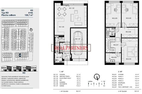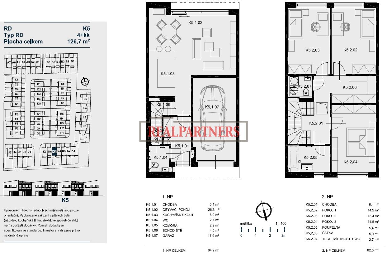 Rodinný dvojpodlažní řádový dům o dispozici 4+kk, o ploše 126m2 na pozemku 197m2, Praze 9 - Satelice Dvojpodlažní řádový dům 4+kk disponuje v 1. NP vlastní garáží, předsíní, toaletou, komorou, prostorným obývací pokojem s kuchyňským koutem a navazující terasou propojující dům se zahradou. V 2. NP se nachází chodba, hlavní ložnice, 2 samostatné pokoje, koupelna s vanou, technická místnost s toaletou a šatna. Zahájení výstavby - podzim 2023, kolaudace a předání klientům - zima 2025. Projekt Domy Praha 9 - Satalické zahrady, nabízí 61 řadových rodinných domů o dispozicí 4+kk a 5+kk, s užitnou plochou až 160 m2, terasou a pozemkami o velikosti až 363 m2. Satalice se stávají velmi vyhledávaným místem pro bydlení, hlavně kvůli své ideální dopravní dostupnosti, velmi dobré občanské vybavenosti a také díky svému ještě stále původnímu vesnickému charakteru. V standardu budou veškerá okna a dveře ve fasádě plastové. Okna v 1. a 2. NP budou opatřena přípravou pro venkovní žaluzie. Garážová vrata budou sekční, zateplená, na dálkové ovládání. Vytápění rodinných domu bude plynovým kotlem a bude řešeno podlahovým rozvodem topení, v koupelnách sušení otopným žebříkem s elektrickým ohřevem. Rezervační poplatek činí 15% zálohy z kupní ceny při podepisování budoucí kupní smlouvy. Doplatek ve výši 85 % kupní ceny uhradíte až po dokončení stavby a po kolaudaci domu. Hypoteční úvěr Vám zajistíme zdarma. V docházkové vzdálenosti naleznete mateřskou školku, základní i soukromou odbornou školu, gymnázium, obecný úřad, obchod, restauraci, knihovnu a také TJ Sokol, tenisový areál, skate nebo bikepark a několik venkovních posiloven. Územím prochází Pražský městský okruh Vysočanská spojka. Kromě autobusové dopravy (bus č. 201, 209, 376 zastávka Dřevařská) můžete využít také vlak, stanice Praha Satalice je v docházkové vzdálenosti od projektu. Autem se do centra města dostanete za 20 minut, stejně jako metrem, zastávka linky C Letňany je cca 8 minut cesty autobusem. Pro aktivní odpočinek navštivte místní parky a sady, nebo vyrazte na procházku po lesní stezce směrem k hradišti ve vinořské oboře. V inzerci jsou fotografie ze vzorového domu.