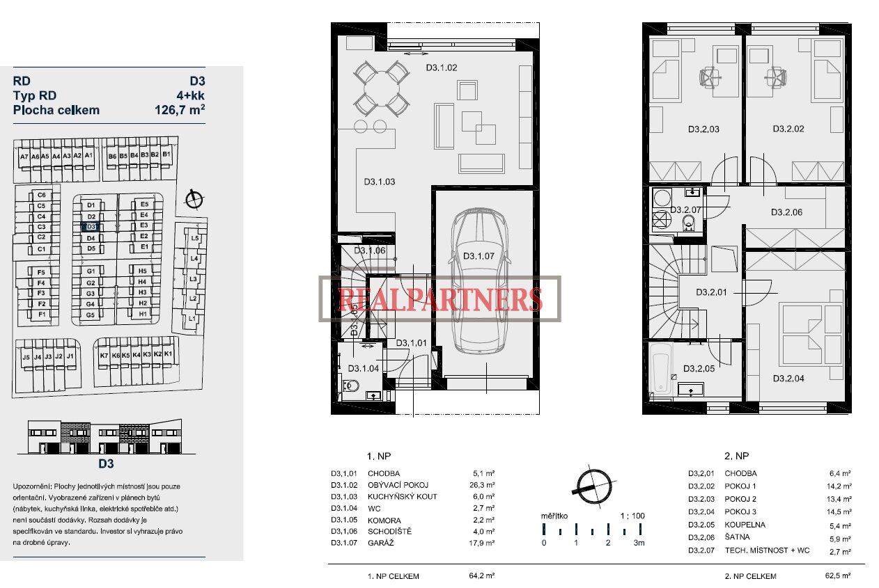 Rodinný dvojpodlažní řádový dům o dispozici 4+kk, o ploše 127m2 na pozemku 179m2, Praze 9 - Satelice Dvojpodlažní řádový dům 4+kk disponuje v 1. NP vlastní garáží, předsíní, toaletou, komorou, prostorným obývací pokojem s kuchyňským koutem a navazující terasou propojující dům se zahradou. V 2. NP se nachází chodba, hlavní ložnice, 2 samostatné pokoje, koupelna s vanou, technická místnost s toaletou a šatna. Zahájení výstavby - podzim 2023, kolaudace a předání klientům - zima 2025. Projekt Domy Praha 9 - Satalické zahrady, nabízí 61 řadových rodinných domů o dispozicí 4+kk a 5+kk, s užitnou plochou až 160 m2, terasou a pozemkami o velikosti až 363 m2. Satalice se stávají velmi vyhledávaným místem pro bydlení, hlavně kvůli své ideální dopravní dostupnosti, velmi dobré občanské vybavenosti a také díky svému ještě stále původnímu vesnickému charakteru. V standardu budou veškerá okna a dveře ve fasádě plastové. Okna v 1. a 2. NP budou opatřena přípravou pro venkovní žaluzie. Garážová vrata budou sekční, zateplená, na dálkové ovládání. Vytápění rodinných domu bude plynovým kotlem a bude řešeno podlahovým rozvodem topení, v koupelnách sušení otopným žebříkem s elektrickým ohřevem. Rezervační poplatek činí 15% zálohy z kupní ceny při podepisování budoucí kupní smlouvy. Doplatek ve výši 85 % kupní ceny uhradíte až po dokončení stavby a po kolaudaci domu. Hypoteční úvěr Vám zajistíme zdarma. V docházkové vzdálenosti naleznete mateřskou školku, základní i soukromou odbornou školu, gymnázium, obecný úřad, obchod, restauraci, knihovnu a také TJ Sokol, tenisový areál, skate nebo bikepark a několik venkovních posiloven. Územím prochází Pražský městský okruh Vysočanská spojka. Kromě autobusové dopravy (bus č. 201, 209, 376 zastávka Dřevařská) můžete využít také vlak, stanice Praha Satalice je v docházkové vzdálenosti od projektu. Autem se do centra města dostanete za 20 minut, stejně jako metrem, zastávka linky C Letňany je cca 8 minut cesty autobusem. Pro aktivní odpočinek navštivte místní parky a sady, nebo vyrazte na procházku po lesní stezce směrem k hradišti ve vinořské oboře. V inzerci jsou fotografie ze vzorového domu.