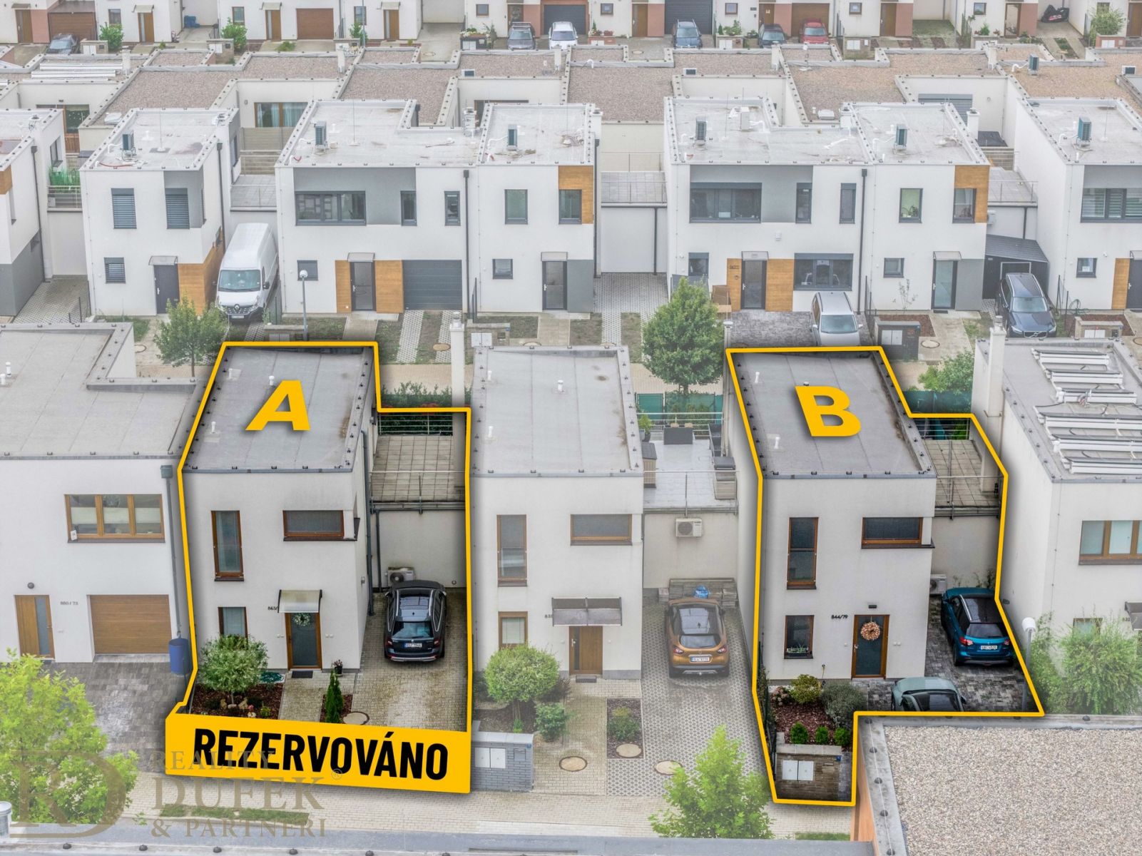 DŮM "A" --> REZERVACE Nabízíme k prodeji dva řadové rodinné domy o dispozici 3+kk a užitné ploše cca 95 m v atraktivní pražské části Jahodnice. Uvedená cena je za jeden RD. Domy zaujmou nadstandardním vybavením, které je odlišuje od okolní zástavby podlahové vytápění, klimatizace v obou podlažích, krb, dvě terasy (z toho jedna krytá pergolou), vzrostlá zahrada se zahradním domkem a kompletně vybavená kuchyň s moderními vestavnými spotřebiči Whirlpool. V přízemí se nachází prostorný obývací pokoj s francouzskými dveřmi vedoucími na terasu a zahradu, dále kuchyňský kout, krb, koupelna se sprchovým koutem a WC, technická místnost a praktická komora pod schody. V patře jsou dvě ložnice, koupelna s vanou a WC a vstup na horní terasu. Každý dům má dvě parkovací místa přímo před domem. Jahodnice nabízí klidné rodinné bydlení v zeleni s výbornou dopravní dostupností do centra Prahy autobusová zastávka je vzdálena přibližně 8 minut chůze, do centra 15 min MHD . V blízkém okolí je kompletní občanská vybavenost školy, školky, zdravotní středisko, obchody i nákupní centrum Europark Štěrboholy. Pro více informací nebo sjednání prohlídky neváhejte kontaktovat naši rodinnou realitní kancelář.