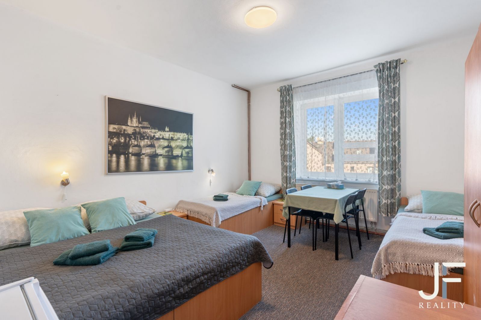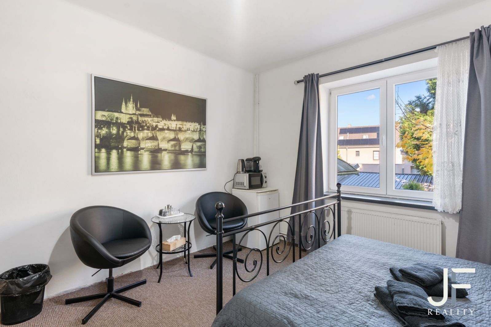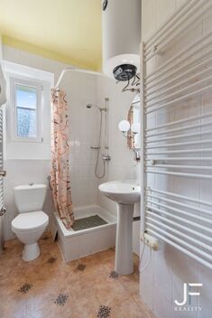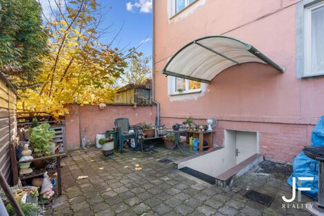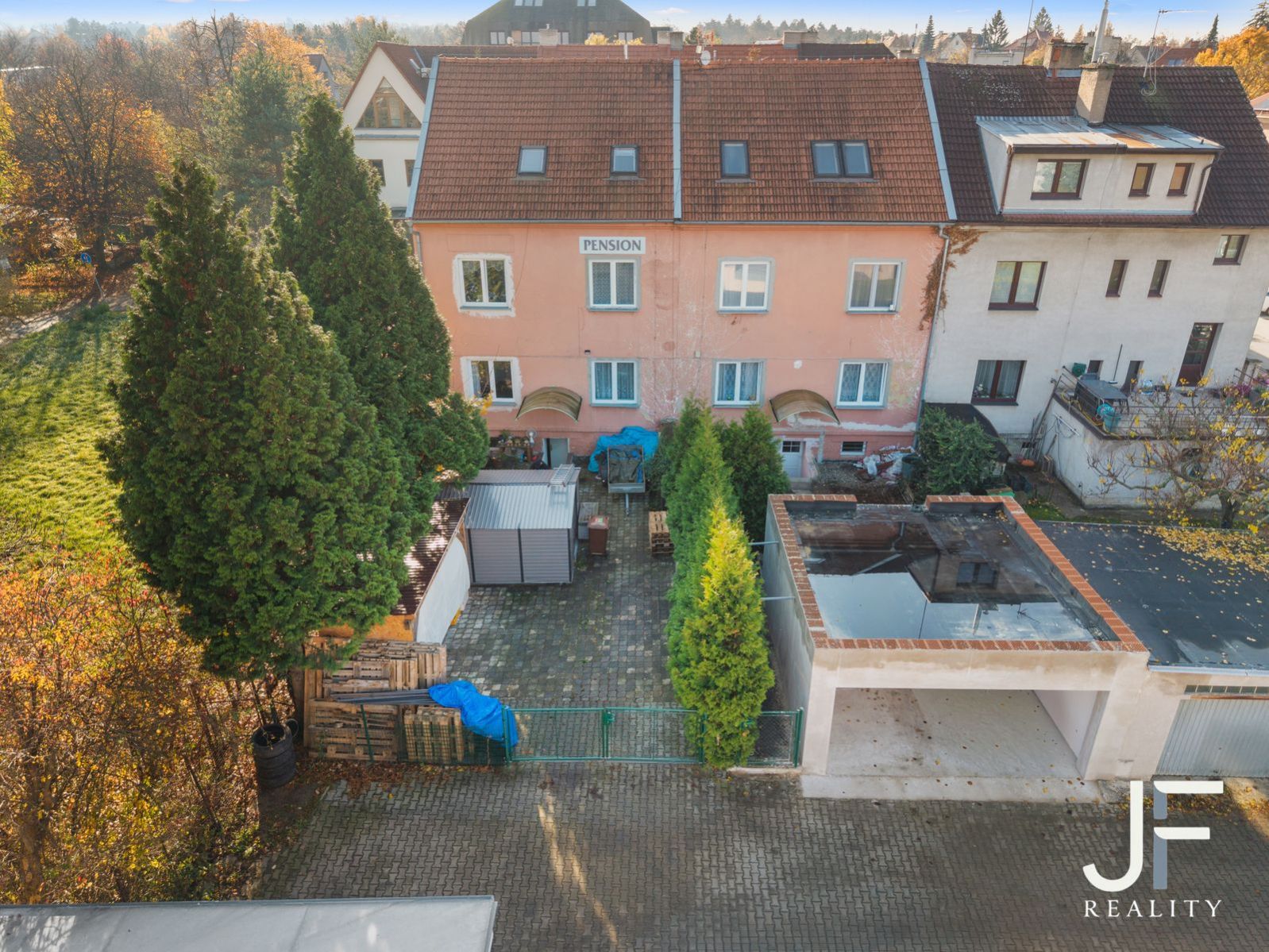 Dům v klidné a skutečně zastrčené ulici nabízí více možností. Jedná se vlastně o polovinu dvojdomu a polořadovou stavbu na konci slepé ulice. Vnitřní uspořádání je prakticky oddělené centrálním schodištěm, takže dům umožňuje kromě vícegeneračního bydlení i kombinaci bydlení a podnikání, čemuž napomáhá nově přistavěná recepce s anglickým dvorkem v přední části domu. Ačkoli je objekt kolaudovaný jako rodinný dům, v posledních letech byl reálně využíván jako penzion. Současně zde funguje také služba Zásilkovny. Na třech podlažích byly tři bytové jednotky dispozice 2+1, nyní je zde celkem osm pokojů krátkodobě i dlouhodobě pronajatých vytvořených jednoduchými stavebními úpravami. V suterénu domu je obytné zázemí pro správce, kotelna a může zde být dostatek skladovacích prostor pro obyvatele domu, nájemce či majitele. V domě probíhaly průběžné rekonstrukce jednotlivých jednotek i technických rozvodů. Byla realizována dostavba recepce a terasy (aktuálně bez kolaudace) a proběhla rekonstrukce topného systému, jehož základem je nový výkonný plynový kotel. Přední strana domu ja zateplená. Celkově je bydlení vhodné k modernizaci a rekonstrukci v rámci, které se opět vrátí stav se třemi jednotkami, které mohou být 2+kk nebo i 3+kk s jednou koupelnou. Objekt je však možné užívat i v současném stavu. Recepce byla dostavěna letos a vyžaduje drobné dokončovací práce, následně kolaudaci. k recepci náleží ještě malá kancelář a anglický dvorek před domem. Za domem se nachází dvorek s pergolou a plechovým zahradním domkem. Potenciál je využít prostor pro parkování 3-4 vozů. Lokalita má dobrou dopravní dostupnost i kompletní občanskou vybavenost. Zastávka metra Roztyly je 15 minut pěší chůzí, nejlepší ocbhodní centrum v Praze, OC Chodov je 20 minut pěší chůzí nebo 4 minuty autobusem... Energetický štítek je v přípravě... <a href="https://www.eurobydleni.cz/komercni-nemovitosti/pension/praha-4/obec-chodov/prodej/"><strong>Prodej penzionu Praha 4, Chodov</strong></a>