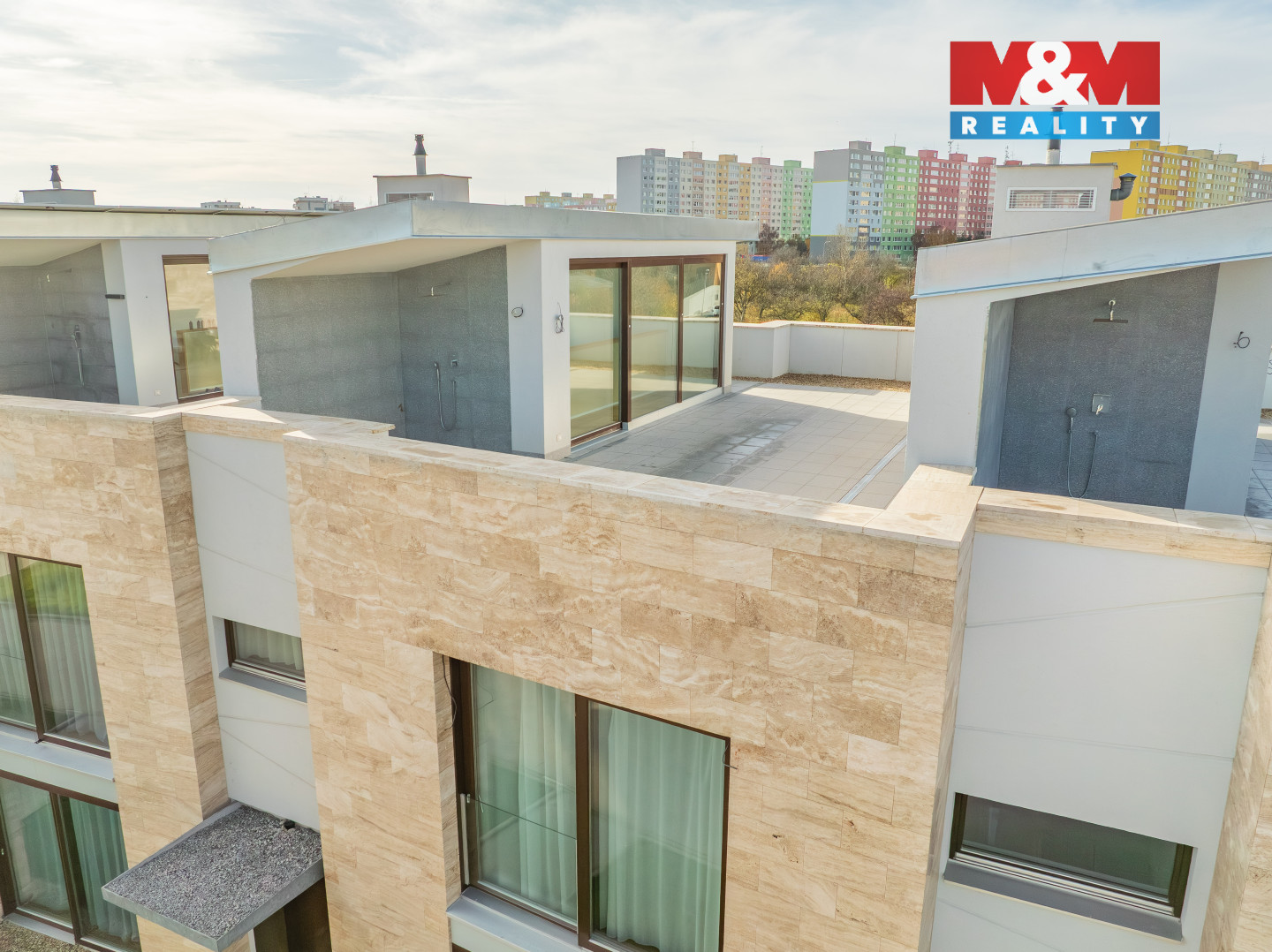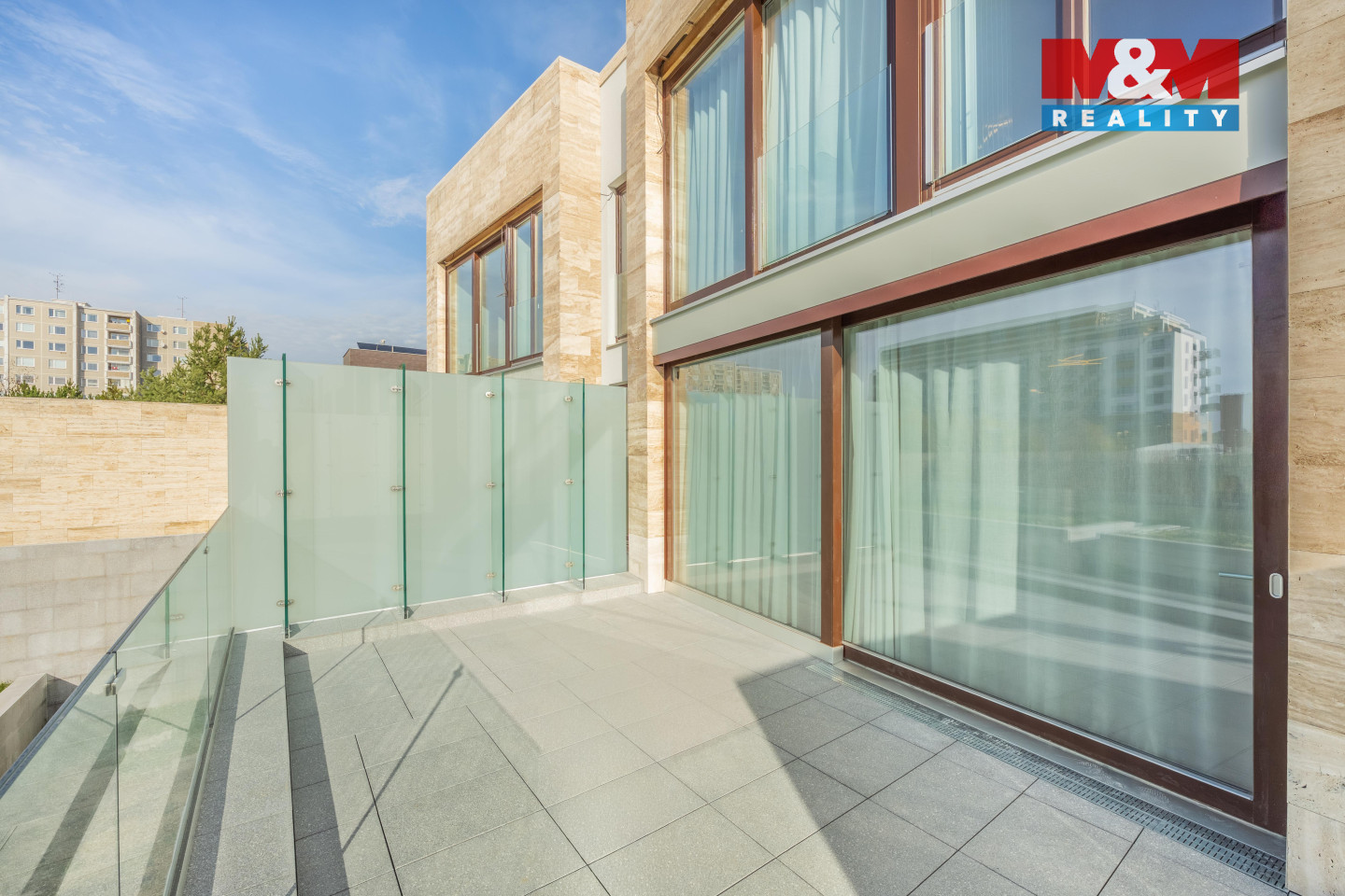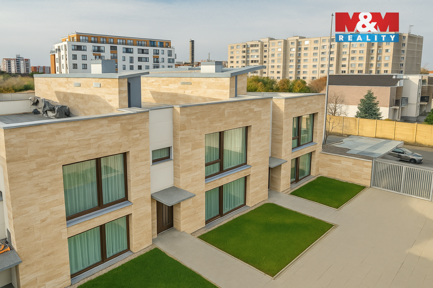 Nabízíme naprosto výjimečný řadový rodinný dům ve velmi vyhledávané části Prahy - Libuši. Tato novostavba nabízí čtyři nadzemní podlaží s celou užitnou plochou 279m2. Moderní a prostorný interiér zahrnuje sedm místností a čtyři koupelny s toaletou. Dům je postaven z prémiových materiálů a je vybaven vestavěnými skříněmi, centrálním vytápěním, bezpečnostním systémem, přípravou pro venkovní elektrické žaluzie. K dispozici jsou dvě terasy - prostorná střešní terasa o ploše 84 m2 a další terasa v prvním patře o velikosti 38 m2 odstíněná od sousedních teras. Zahrada za domem má rozlohu 96 m2, předzahrádka před domem má pak 32 m2. Fasáda celého domu je obložena kamenným obkladem z travertinu. Dvě podzemní garážová stání zajišťují komfortní parkování a vstup z garáže přímo do domu. Nemovitost se nachází v klidné části uzavřeného areálu hned vedle budoucí stanice metra C a je připravena k okamžitému nastěhování. Nepropásněte tuto jedinečnou příležitost. Energetický štítek B.
