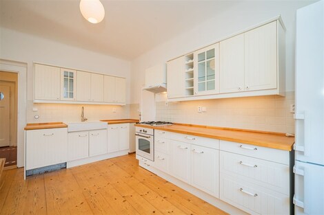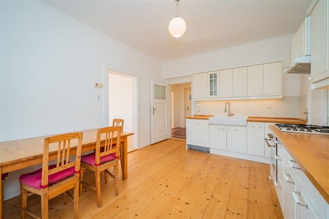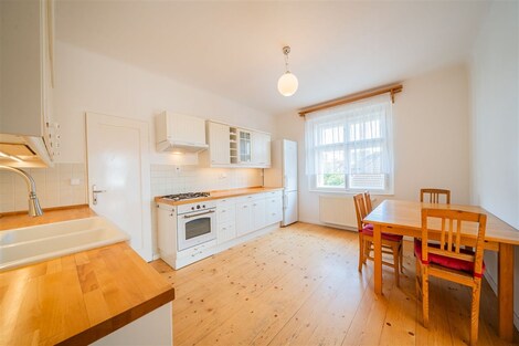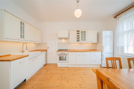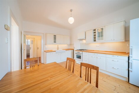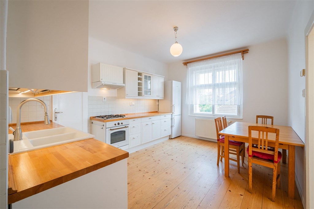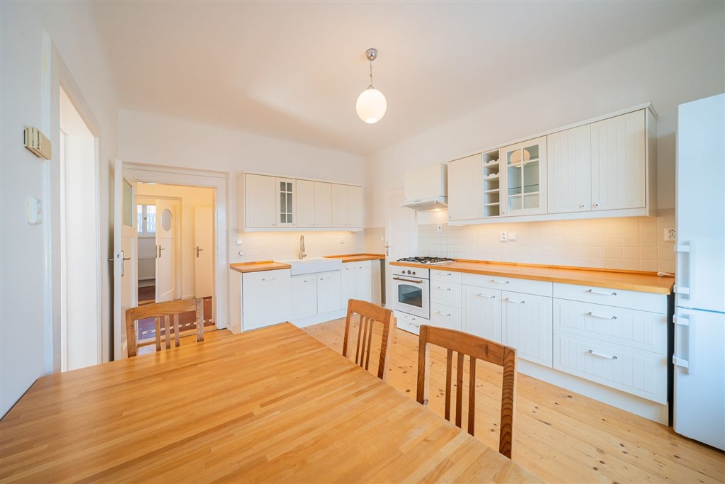 Nabízíme od 1. 3. 2026 (případně dříve - na dotaz) k pronájmu prostorný byt 5+1 ve stylové prvorepublikové vile ze 30. let ve vilové čtvrti Prahy 4 - Modřany, ulice Nečova. Ideální pro rodiny vracející se do Prahy ze zahraničí nebo pro expaty hledající autentické bydlení s charakterem. Nabídka je obzvlášť vhodná pro rodiny s dětmi díky blízkosti Prague British International School - Libuš campus. Byt má dispozici 5+1 s čistou obytnou plochou 150 m2 a nabízí využitelnou půdu, sdílenou kolárnu, zastřešenou terasu, parkovací stání na vlastním pozemku a malou zahrádku na samostatném pozemku o velikosti 110 m2. Vila prošla citlivou rekonstrukcí a zachovala si výrazné prvorepublikové prvky - kombinace historického šarmu s moderním komfortem. DISPOZICE: Byt je rozložen do tří nadzemních podlaží. 1. NP: Vstupní zádveří s úložným prostorem a vstupem do sklepa. 2. NP (hlavní obytné patro): Stylová kuchyň se značkovými spotřebiči a spíží, prostorný obývací pokoj s balkonem do ulice a oknem do zahrady, ložnice, koupelna s vanou, pračkou a kombinovaným plynovým kotlem, samostatné WC. 3. NP (podkroví): Prostorná obytná místnost se vstupy do dvou menších ložnic a koupelny s WC. Zákoutí nabízí další prostor na spaní pro třetí dítě nebo návštěvy. Součástí je nika pro uložení šatstva. Mezipatro: Zastřešená terasa se sedacím nábytkem - ideální pro ranní kávu nebo večerní relax. Půda: Pochozí, určená k uložení věcí, přístupná dřevěným schodištěm. TECHNICKÉ VYBAVENÍ: Dům je napojen na všechny inženýrské sítě včetně optického vysokorychlostního internetu (ideální pro home office). Byt je aktuálně vymalován na bílo, obytné místnosti jsou částečně vybaveny nábytkem. IDEÁLNÍ PRO: • Rodiny vracející se do ČR ze zahraničí • Expat rodiny s dětmi • Zaměstnance mezinárodních firem • Ty, kdo oceňují autentické bydlení s historií a charakterem LOKALITA A DOSTUPNOST: Tylova čtvrť nabízí výbornou dopravní dostupnost - tramvaje směr centrum přes Braník, autobusy na metro C (Budějovická, Kačerov) i metro B (Smíchovské nádraží). Občanská vybavenost: Školy, školky, mezinárodní školy (Prague British International School - 5 min autem), poliklinika, obchodní centra, supermarkety (Billa, Kaufland, Lidl). Příroda a sport: Modřanská rokle, Kunratický les, cyklostezky, sportovněkulturní zóna v Braníku s restauracemi. FINANČNÍ PODMÍNKY: Nájemné: 42 000 Kč/měsícPoplatky: 8 500 Kč/měsíc Kauce: 84 000 Kč Provize: 42 000 Kč + DPH Prohlídky možné po dohodě. Více informací na prohlídce.