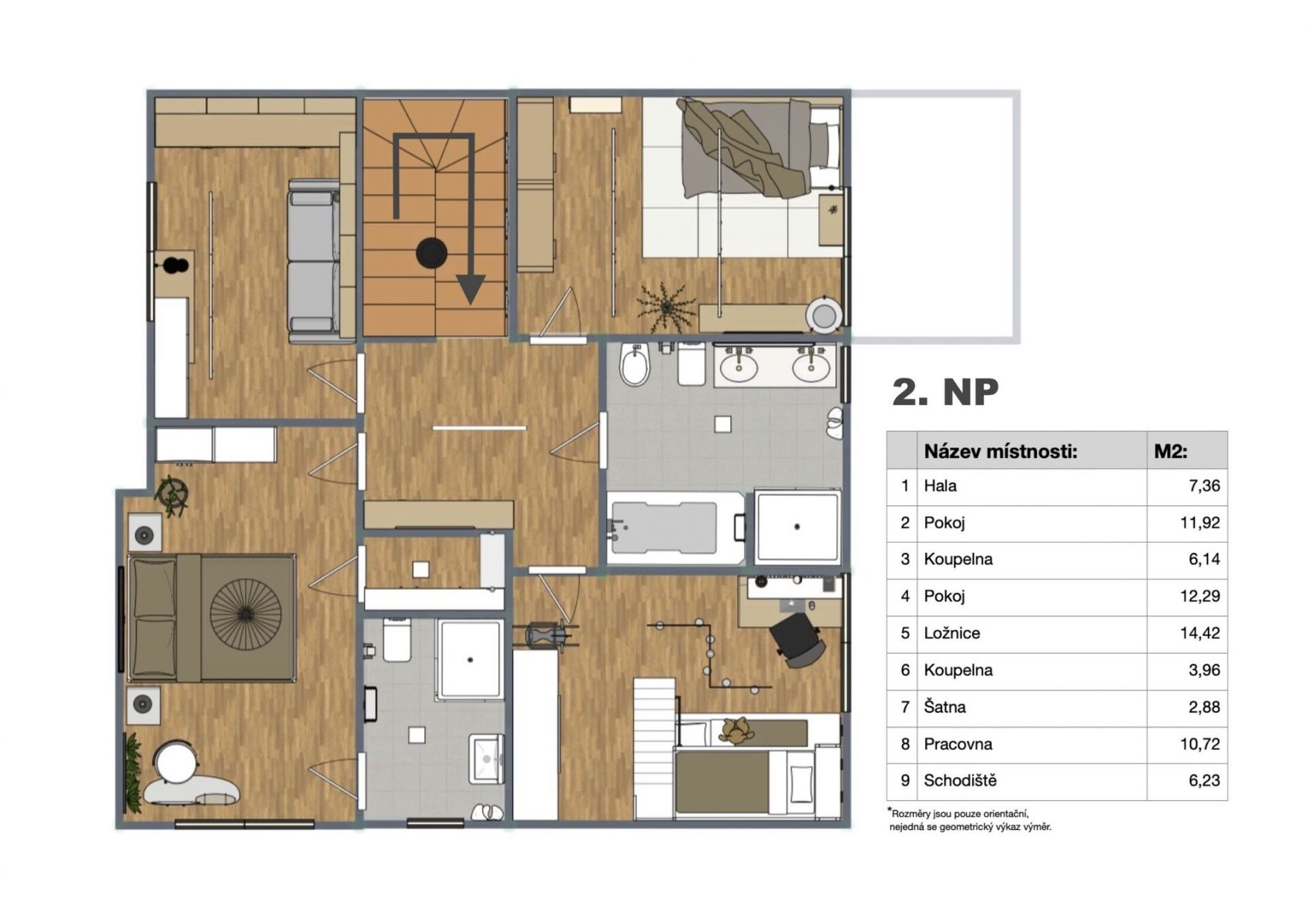 Pronájem velkého rodinného domu 6+1, (471m2), velký obývací pokoj s jídelním koutem, krbem a vstupem na terasu, plně vybavená kuchyně, 5 ložnic se…